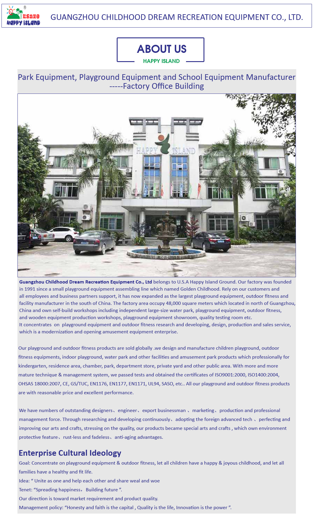 Guangzhou Happy Island Education and Recreation Co. , Ltd. concentrates on R&D, design production, process and sales service, which is the largest-scaled and integrated toy production enterprise in South China, our products are sold globally .we design and manufacture children playground, fitness equipments, indoor playground, water park and other facilities and amusement products which professionally for kindergarten, residence area, chamber, park, department store, private yard and other public area.