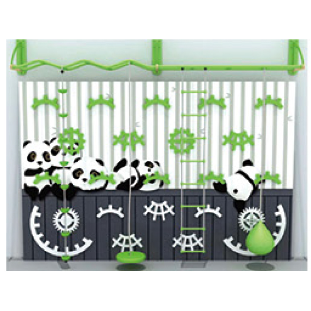 Play climbing equipment, mainly green color, decorated cute panda patterns and gear shapes, fish bone shapes climbing handles; facility with green water drops and bamboo designs, creates child fun atmosphere fits children climbing play.