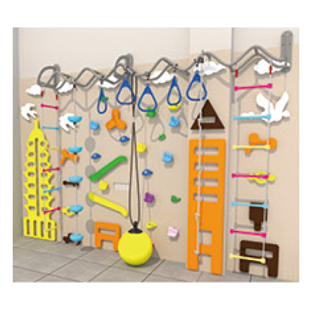 Play climbing structure, bright colors with creative design. Facility includes multiple climbing elements like yellow towers, orange stairs, green hanging rings, also decoration elements like white clouds, flying birds; center with a big yellow ball adds fun, fits children climbing and play.